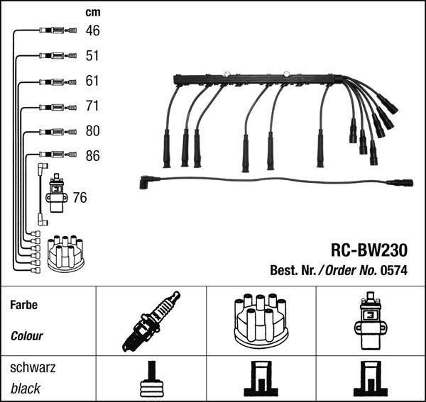Prvotřídní kvalita NGK v provedení měděného zapalovacího kabelu s odrušovacími rezistory, kabelu s uhlíkovými rezistory nebo zapalovacího kabelu s indukčními rezistory.