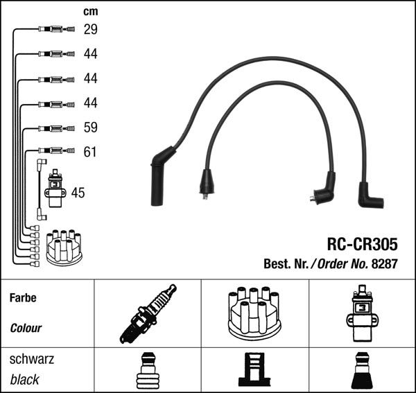 Prvotřídní kvalita NGK v provedení měděného zapalovacího kabelu s odrušovacími rezistory, kabelu s uhlíkovými rezistory nebo zapalovacího kabelu s indukčními rezistory.
