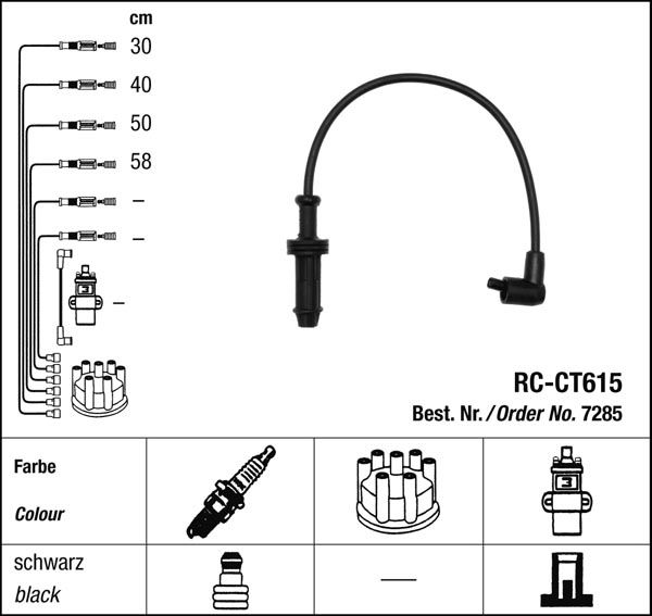 Prvotřídní kvalita NGK v provedení měděného zapalovacího kabelu s odrušovacími rezistory, kabelu s uhlíkovými rezistory nebo zapalovacího kabelu s indukčními rezistory.