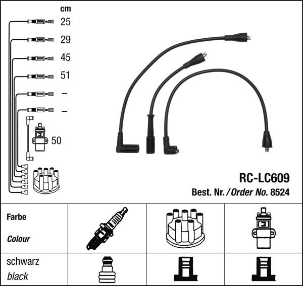 Prvotřídní kvalita NGK v provedení měděného zapalovacího kabelu s odrušovacími rezistory, kabelu s uhlíkovými rezistory nebo zapalovacího kabelu s indukčními rezistory.