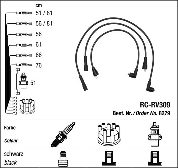 Prvotřídní kvalita NGK v provedení měděného zapalovacího kabelu s odrušovacími rezistory, kabelu s uhlíkovými rezistory nebo zapalovacího kabelu s indukčními rezistory.