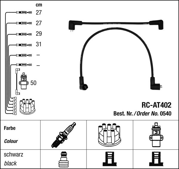 Prvotřídní kvalita NGK v provedení měděného zapalovacího kabelu s odrušovacími rezistory, kabelu s uhlíkovými rezistory nebo zapalovacího kabelu s indukčními rezistory.