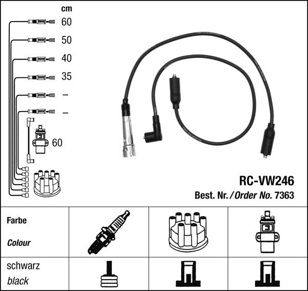 Prvotřídní kvalita NGK v provedení měděného zapalovacího kabelu s odrušovacími rezistory, kabelu s uhlíkovými rezistory nebo zapalovacího kabelu s indukčními rezistory.